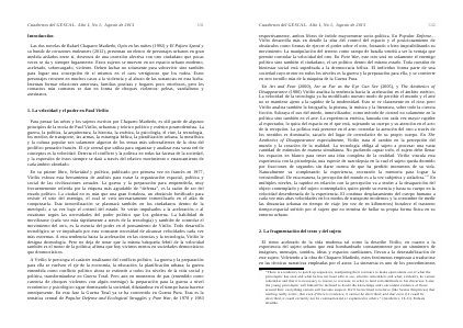 En Art and Fear( 2000), Art as Far as the Eye Can See( 2005), y The Aesthetics of Disappearance( 1980) Virilio analiza la tendencia hacia la aceleración en el ámbito estético. La velocidad de la tecnología ya ha modificado nuestro modo de percibir el mundo y el arte no se mantiene ajeno a la rapidez de la modernidad. Esto se ve claramente en el cine, pero Virilio analiza también la fotografía, la pintura, la música y la literatura, sobre todo la ciencia ficción. Subraya el uso del miedo, inmovilizador, como método de control no solamente en la política sino también en el arte. La experiencia estética, lanzada con cada vez mayor rapidez al espectador, lo quita del espacio en el que está, sujetando su cuerpo y su atención en el acto de la recepción. La política está presente en el arte: controlar la atención del otro a través de los sentidos es dominarlo, sacarlo del lugar de controlador de su propio cuerpo. En The Aesthetics of Disappearance especialmente, Virilio trata el cambio en la percepción del mundo y la creación de la realidad. La tecnología obliga al sujeto a procesar una vasta cantidad de estímulos de manera simultánea. No pudiendo captar todo, el sujeto debe llenar los espacios en blanco para tener una idea completa de la realidad. Virilio vincula esta experiencia con la picnolepsia, una especie de narcolepsia en la cual el sujeto queda dormido por fracciones de segundos sin darse cuenta de que ha perdido momentos de su vida. Naturalmente va completando la experiencia, recreando la memoria para lograr la verosimilitud. De esta manera, la percepción del mundo es a la vez subjetiva y aisladora. 232 En múltiples niveles, la rapidez en relación con la percepción va a tender a la desaparición del objeto contemplado y del sujeto contemplador, quien pierde su esencia y hasta su cuerpo en la velocidad desenfrenada de la experiencia. El continuo desplazamiento del cuerpo humano a cada vez más altas velocidades en los modos de transporte modernos y la costumbre de medir las distancias urbanas en tiempo de viaje( en vez de en kilómetros) fortalece el trastorno tiempo-espacial sufrido por el sujeto que no termina de hallar su propia forma física en su entorno urbano.