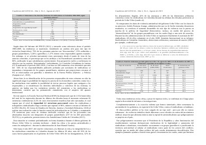 Según datos del Informe del PNUD( 2011) y tomando como referencia ahora el período 1988-2009, las tendencias se mantienen. Atendiendo un análisis sólo para este tipo de violación( homicidios): 70 % de las presuntas autorías son“ desconocidas”, 25 % atribuidas a grupos paramilitares, 3,26 % a guerrillas y 1,37 % tienen como responsables agentes estatales. Sin embargo, si se calculan nuevamente estos porcentajes desde el punto de vista de las autorías conocidas, el porcentaje que se les atribuye a los Paramilitares ascendería a más del 80 %, ratificando lo que calculábamos anteriormente. Esta proporción vuelve a confirmarse en relación con las autorías“ determinadas” judicialmente. La Comisión Colombiana de Juristas( CCJ) analizando el período 2002-2010 y con base en 280 sentencias circa determinó que más del 60 % de las responsabilidades judiciales probadas por asesinatos de sindicalistas se imputaban a integrantes de los grupos paramilitares; mientras que proporciones cercanas al 9 % se relacionaban con guerrillas o miembros de la Fuerza Pública( Ejército y Policía)( Sanjuán et al., 2010).
