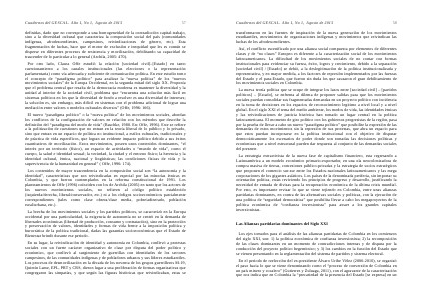 Así, el conflicto escenificado por una alianza social compuesta por elementos de diferentes clases y de“ no clases” Europeo es diferente a la caracterización social de los movimientos latinoamericanos. La dificultad de los movimientos sociales de no contar con formas institucionales para evidenciar su fuerza, éxito, logros y crecimiento, debido a la separación [ sociedad civil ] / [ Estado ] se debió, a la deslegitimación de la política institucionalizada y representativa, y en mayor medida, a los factores de represión implementados por las fuerzas del Estado y el para-Estado, que fueron sin duda los que causaron el gran debilitamiento de los movimientos sociales en Colombia.