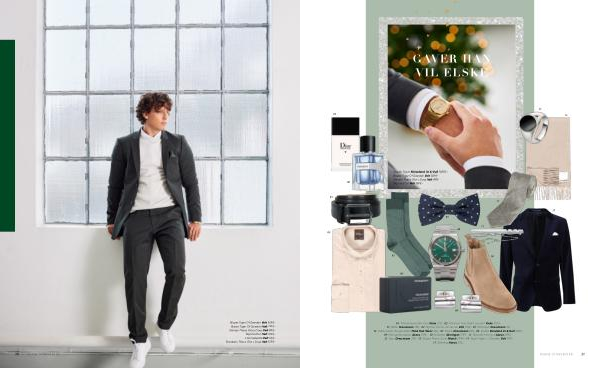 01 . Aftershave balm Dior Kicks 720 , - 02 . Parfyme Yves Saint Laurent Kicks 1000- 03 . Belte Dressmann 399 , - 04 . Skjorte Oscar Jacobsen Volt 1399 , - 05 . Strømper Dressmann 59 , - 06 . Hårprodukr Rough Rider Think Hair Wear 459 , - 07 . Sløyfe Dressmann 299 , - 08 . Klokke Kleivland Ur & Gull 9085 , - 09 . Mansjettknapper Aseco 8195 , - 10 . Skoletter Skoringen 1399 , - 11 . Slipsnål hvitt gull Aseco 6990 , - 12 . Slips Dressmann 299 , - 13 . Blazer Mario Conti Match 2999 , - 14 . Skjerf Tiger of Sweden Volt 999 , - 15 . SølvrIng Aseco 835 , -