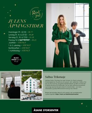 Hverdager ( 11 . -22.12 ) - 10-22 Lørdag ( 9 ., 16 . & 23.12 ) - 10-20 Søndag ( 3 ., 10 . & 17.12 ) - 14-19 Fredag 15.12 NATTÅPENT - 10-23 Julaften – STENGT 1 . & 2 . juledag – STENGT Nyttårsaften – STENGT 1 . nyttårsdag – STENGT