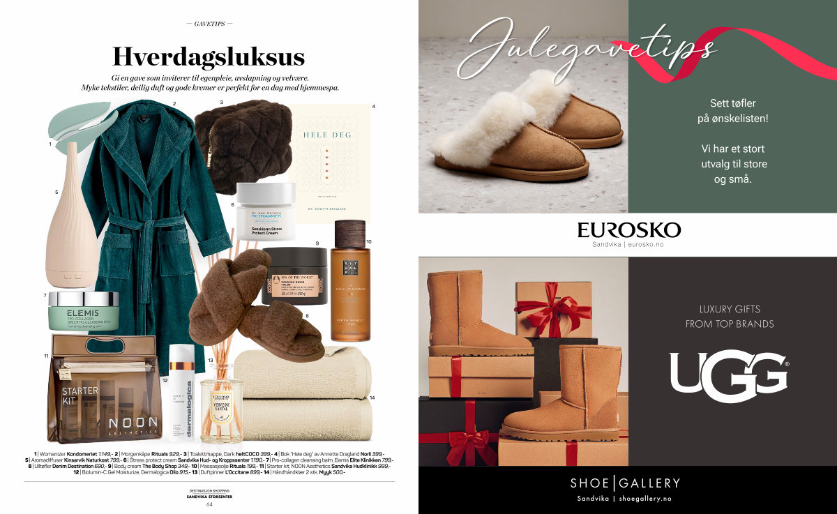1 | Womanizer Kondomeriet 1.149,- 2 | Morgenkåpe Rituals 929,- 3 | Toalettmappe, Dark heltCOCO 399,- 4 | Bok” Hele deg” av Annette Dragland Norli 399,- 5 | Aromadiffuser Kinsarvik Naturkost 799,- 6 | Stress protect cream Sandvika Hud- og Kroppssenter 1.190,- 7 | Pro-collagen cleansing balm, Elemis Elite Klinikken 799,- 8 | Ulltøfler Denim Destination 690,- 9 | Body cream The Body Shop 349,- 10 | Massasjeolje Rituals 199,- 11 | Starter kit, NOON Aesthetics Sandvika Hudklinikk 999,- 12 | Biolumin-C Gel Moisturize, Dermalogica Olio 915,- 13 | Duftpinner L’ Occitane 899,- 14 | Håndhåndklær 2 stk. Myyk 500,-