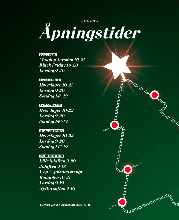 Lille julaften 9-20 Julaften 9-13 1. og 2. juledag stengt Romjulen 10-21 Lørdag 9-19 Nyttårsaften 9-16