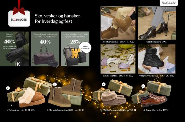 3 . Wollies skinntøffel 699 , - str . 36-41 4 . Bugatti herresko , 1399 , -