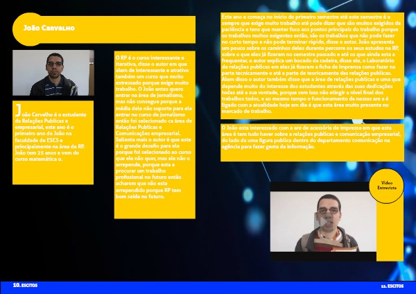 Este ano e começa no inicio do primeiro semestre até este semestre é o sempre que exige muito trabalho até pode dizer que são muitos exigidos da paciência e tens que manter foco aos pontos principais do trabalho porque os trabalhos muitos exigentes então, são os trabalhos que não pode fazer no curto tempo e não pode terminar rápido, disse o autor. João apresenta um pouco sobre os caminhos deles durante percorre os seus estudos na RP, sobre o que eles já fizeram no semestre passado e até os que ainda esta a frequentar, o autor explica um bocado da cadeira, disse ele, o Laboratório de relações publicas em eles já fizeram a ficha de Imprensa como fazer na parte tecnicamente e até a parte de teoricamente das relações publicas. Alem disso o autor também disse que a área de relações publicas e uma que depende muito do interesse dos estudantes através das suas dedicações todas até a sua vontade, porque sem isso não atingir a nível final dos trabalhos todos, e ao mesmo tempo o funcionamento da nessas are a é ligado com a atualidade hoje em dia é que esta área muito presente no mercado de trabalho.