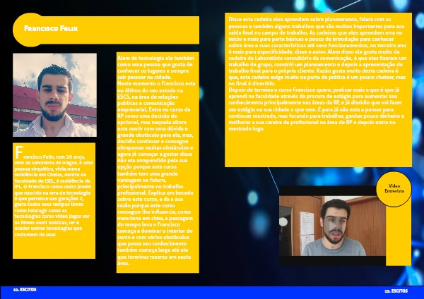 Neste momento o Francisco esta no último do seu estudo na ESCS, na área de relações publicas e comunicação empresarial. Entra no curso de RP como uma decisão de opcional, mas naquela altura esta sentir com uma dúvida e grande obstáculo para ele, mas, decidiu continuar e consegue ultrapassar muitas obstáculos e agora já começar a gostar disse não eta arrependido pela sua opção porque este curso também tem uma grande vantagem no futuro, principalmente no trabalho profissional. Explica um bocado sobre este curso, e da a sua razão porque este curso consegue-lhe influencia, como menciona em cima, a passagem do tempo leva o Francisco começa a dominar o interior do curso e com vários obstáculos que passa seu conhecimento também começa larga até ele que terminar mesmo em nesta área.