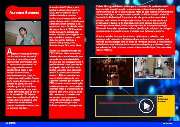 E alem disso gostei desta cadeira que a tratamento da professora muito bom e muito simpático então aumenta sua vontade de aprende para aprender mais do que é que ele gosta. Alem de esta cadeira, haver também outra cadeira que consegue matar o paixão do Alfonso é que cadeira da Laboratório Audiovisual, é que disse ele, ele gosta muito este cadeira porque, este cadeira focado para parte de pratica, principalmente, pré produção; produção e pós-produção, onde esta cadeira ensina sobre construção de um filme, inicio com pré produção até ao pós-produção. Disse o ALfonso eles aprendem sobre a planificação até plano de rodagem e agora esta no processo de pós-produção para terminar o projeto.