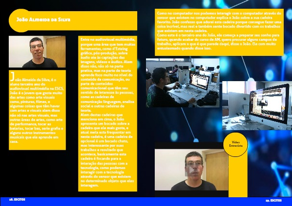 João Almeida da Silva, é o aluno terceiro ano do audiovisual multimédia na ESCS, João é o jovem que gosta muito das artes como arte visuais como, pinturas, filmes, e algumas coisas que têm haver com artes e visuais alem disso não só nas artes visuais, mas outras áreas de artes, como arte de performance, tocar as batarias, tocar bas, serie grafia e alguns outros instrumentos musicais que ele aprende em casa.