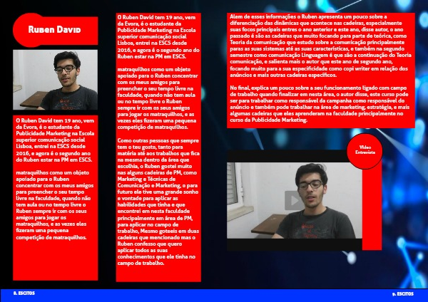 Alem de esses informações o Ruben apresenta um pouco sobre a diferenciação das dinâmicas que acontece nas cadeiras, especialmente suas focos principais entres o ano anterior e este ano, disse autor, o ano passado é são as cadeiras que muito focando para parte de teórica, como Teoria da comunicação que estudo sobre a comunicação principalmente paras as suas sistemas até as suas características, e também na segundo semestre como comunicação Linguagem é que são a continuação do Teoria comunicação, e salienta mais o autor que este ano de segundo ano, focando muito para a sua especificidade como copi writer em relação dos anúncios e mais outras cadeiras específicos.
