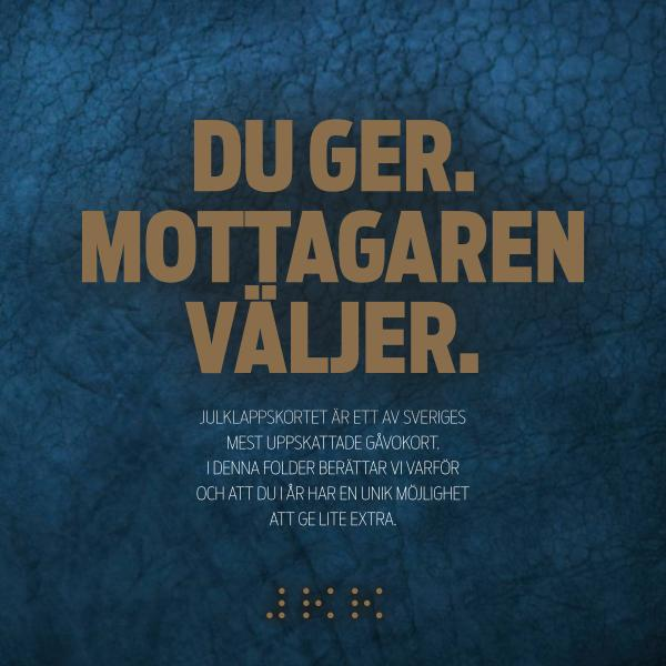 JULKLAPPSKORTET ÄR ETT AV SVERIGES MEST UPPSKATTADE GÅVOKORT . I DENNA FOLDER BERÄTTAR VI VARFÖR OCH ATT DU I ÅR HAR EN UNIK MÖJLIGHET ATT GE LITE EXTRA .