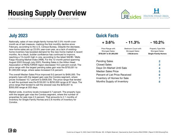 Nationally , sales of new single-family homes fell 2.5 % month-overmonth as of last measure , marking the first monthly decline since February , according to the U . S . Census Bureau . Despite the decrease , new-home sales are up 23.8 % year-over-year , as a lack of existinghome inventory has boosted demand for the new-home market in recent months . As a result , builder confidence has continued to improve , reaching a 13-month high in July , according to the latest NAHB / Wells Fargo Housing Market Index ( HMI ). For the 12-month period spanning August 2022 through July 2023 , Pending Sales in the Hilton Head Association of REALTORS ® region decreased 16.5 percent overall . The price range with the largest pending sales gain was the $ 750,001 to $ 1,000,000 range , where sales increased 3.6 percent .