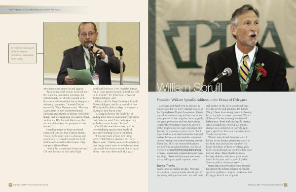 Greetings and thank you in advance as you prepare for the 143 rd Annual Session of the Pennsylvania Dental Association . Thank you all for volunteering and for your active participation so that , together , we may guide our great profession and our Association . Usually the President ’ s Report is a review of the progress on the year ’ s initiatives and this will be a review to some extent . But I hope much of that information has been self evident because of our member communications through our award-winning Journal , Transitions , all of our other publications , our newly re-designed website , our Social Network at www . community . padental . org , e-Grams , newsletters , Capwiz alerts and even my blogs . I have written many and some are actually quite good ( opinion , mine ).