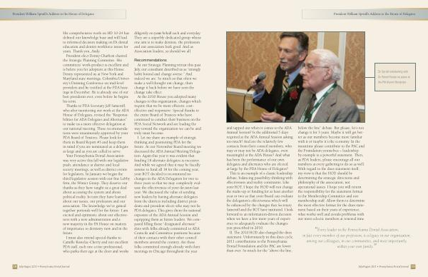 Your Pennsylvania Dental Association was very active this fall with our legislative push , attendance at district and local society meetings , as well as district events for legislators . In January we began the third legislative session with our fine Lobby firm , the Winter Group . They deserve our thanks as they have taught us a great deal about accessing the system and about political reality . In turn they have learned about our issues , our profession and our association . The knowledge we ’ ve gained together portends well for the future . I am excited and optimistic about our effectiveness with a new administration and a new majority in the PA House on matters of importance to dentistry now and in the future .