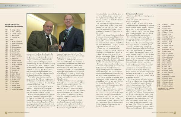 There are many of you here today who know Dr . Galeone through his editorials in the Pennsylvania Dental Journal or by simply working beside him here in the House of Delegates . We have all enjoyed his vibrant and refreshing style of writing and his sharp wit and unique sense of humor that serve as the cornerstone of his engaging and upbeat personality . If there is fun and laughter to be had you will often find Rich in the middle of it . For him laughter is truly the best medicine and he shares it with others everyday .