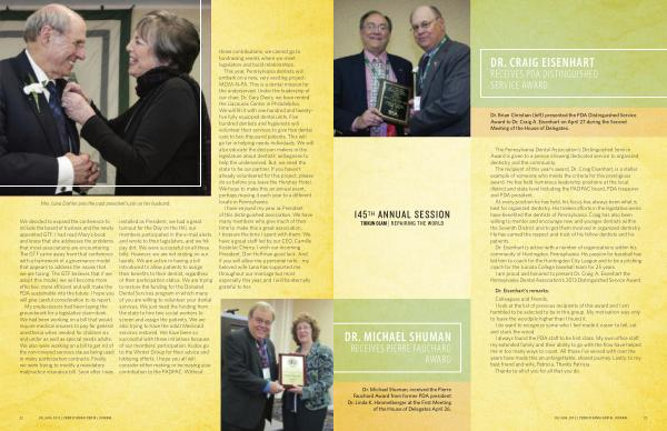 My predecessors had been laying the groundwork for a legislative slam-dunk . We had been working on a bill that would require medical insurers to pay for general anesthesia when needed for children six and under as well as special needs adults . We also were working on a bill to get rid of the non-covered services clause being used in many participation contracts . Finally , we were trying to modify a mandatory malpractice insurance bill . Soon after I was installed as President , we had a great turnout for the Day on the Hill , our members participated in the e-mail alerts and wrote to their legislators , and we hit pay dirt . We were successful on all three bills . However , we are not resting on our laurels . We are active in having a bill introduced to allow patients to assign their benefits to their dentist , regardless of their participation status . We are trying to restore the funding for the Donated Dental Services program in which many of you are willing to volunteer your dental services . We just need the funding from the state to hire two social workers to screen and assign the patients . We are also trying to have the adult Medicaid services restored . We have been so successful with these initiatives because of our members ’ participation . Kudos go to the Winter Group for their advice and lobbying efforts . I hope you all will consider either making or increasing your contribution to the PADPAC . Without those contributions , we cannot go to fundraising events where we meet legislators and build relationships .