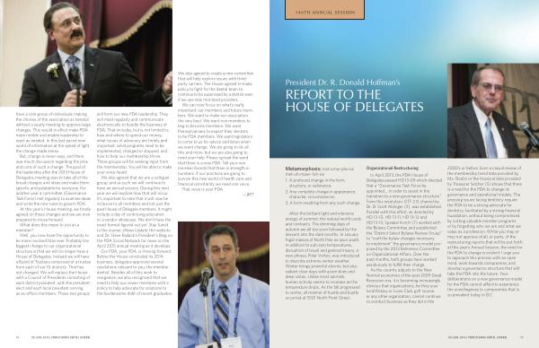 We also agreed that we are a collegial group , and as such we will continue to have an annual session . During this next year we will explore how that will occur . It ’ s important to note that it will now be inclusive to all members and not just the past House of Delegate members . It might include a day of continuing education or a vendor showcase . We don ’ t have the exact format figured out yet . Stay tuned to the Journal , eNews Update , the website and Dr . Steve Radack ’ s President ’ s Blog on the PDA Social Network for news on the April 2015 annual meeting as it develops .