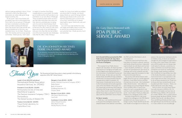 The recipient of our Public Service Award is Dr . Gary Davis . Dr . Davis has been a driving force in bringing oral health care to the indigent and underserved both in his community in Cumberland County and lands far away . He has seen up close the barriers faced , the difficult living conditions and the lack of living necessities that the average person takes for granted . All these years of dedicated service built up to the monumental role he took as general chair of the first MOM-n-PA project . For his unwavering commitment and inspiring leadership that brings quality oral health care to those most in need , Pennsylvania Dental Association is pleased to honor Dr . Davis with the 2014 Public Service Award .