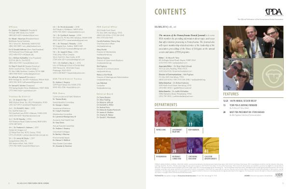 PENNSYLVANIA DENTAL JOURNAL ( ISSN 0031-4439 ), owned and published by the Pennsylvania Dental Association , 3501 North Front Street , Harrisburg , 17110 , is published bi-monthly : Jan / Feb , Mar / Apr , May / June , July / Aug , Sept / Oct , Nov / Dec . Address advertising and subscription queries to 3501 North Front Street , P . O . Box 3341 , Harrisburg , 17105 . Domestic subscriptions are available to persons not eligible for membership at $ 36 / year ; International subscriptions available at $ 75 / year . Single copies $ 10 . Periodical postage paid at Harrisburg , PA . “ The Pennsylvania Dental Association , although formally accepting and publishing reports of the various standing committees and essays read before the Association ( and its components ), holds itself not responsible for opinions , theories , and criticisms therein contained , except when adopted or sanctioned by special resolutions .” The Association assumes no responsibility for any program content of lectures in continuing education programs advertised in this magazine . The Association reserves the right to refuse any advertisement for any reason . Copyright © 2014 , Pennsylvania Dental Association .