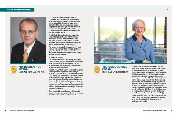 Dr . Joan I . Gluch has been honored with the 2021 PDA Public Service Award for her commitment to the oral health of underserved individuals . As the Professor of Clinical Community Oral Health and the Division Chief of Community Oral Health at the University of Pennsylvania ’ s School of Dental Medicine , Dr . Gluch has expanded community outreach programs and established an academically based service-learning course at Penn Dental Medicine serving approximately 20,000 individuals annually . As part of that expansion , Dr . Gluch has secured significant funding sources to support the programs , including a grant to allow all predoctoral students to have clinical experience with children in their first five years of life . Penn Dental Medicine was one of 11 dental schools nationwide to receive the “ first five ” Health Resources and Services Administration ( HRSA ) grant .