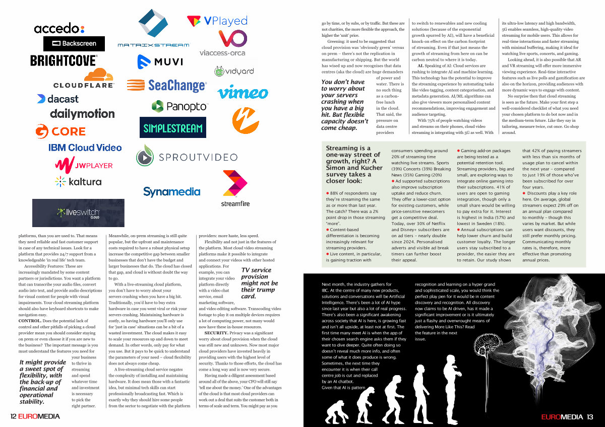 AI. Speaking of AI: Cloud services are rushing to integrate AI and machine learning. This technology has the potential to improve the streaming experience by automating tasks like video tagging, content categorisation, and metadata generation. AI / ML algorithms can also give viewers more personalised content recommendations, improving engagement and audience targeting.