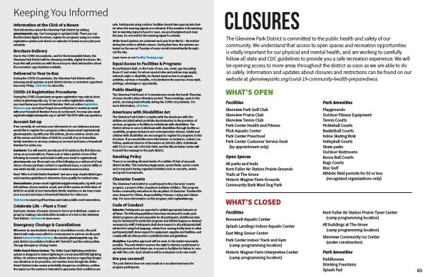 Keeping You Informed Information at the Click of a Mouse Find information about the Glenview Park District by visiting glenviewparks.org. Our homepage is updated daily. There you can find the latest digital brochure, register for programs using our online registration system and check our calendar of events as you plan your schedule. Brochure Delivery Due to the COVID-19 pandemic, and for the foreseeable future, the Glenview Park District will be releasing monthly, digital brochures. We hope this will provide you with the most up-to-date information about the recreation opportunities available. Delivered to Your In-Box During the COVID-19 pandemic, the Glenview Park District will be releasing email updates on park district stories or recreation opportunities every Friday. Click here to subscribe. COVID-19 Registration Procedures During the COVID-19 pandemic program registration may only be done online at glenviewparks.org. To use our online registration system, you must know your Household Number. Visit our online Registration Welcome page and select Forgot Account Number to receive an email with your Household Number if you do not know it. You may also email registration@glenviewparks.org or call 847-724-5670 with any questions. Account Set-up If we currently do not have your information in our database and you would like to register for a program online please email registration@ glenviewparks.org with your full address, phone number, email, and all the names and full dates of birth for your/all of your immediate family members so we may create your account and issue a Household Number for online use. Residents: You will need to provide proof of residency the first time you set up an account with us. Please scan or take a picture of one of the following documents and include it with your email to registration@ glenviewparks.org. We accept one of the following as a valid proof of residency: a house purchase contract or apartment lease, a current utility or real estate tax bill, or a homeowners or rental insurance policy. Read “Who Is A Park District Resident” and see a map of park district general boundary guidelines to determine if you qualify for resident rates. Nonresidents: please email registration@glenviewparks.org with your full address, phone number, email, and all the names and full dates of birth for your/all of your immediate family members so we may create your account and issue a Household Number for online use. Click here to reserve golf tee times and make paddle court reservations. Celebrate Life – Plant a Tree! Each year, dozens of people choose to honor an individual, couple or group by making a tax-deductible donation of a tree to the Glenview Park District. Click here to learn more. Emergency Closings & Cancellations Whenever an unscheduled closing or cancellation occurs, the park district will make every effort to communicate to patrons via the park district Rainout Hotline Service, the website glenviewparks.org, the park district Cancellation Hotline 847-724-3337 and the metropolitan Chicago Emergency Closing Center. Strike Guard Alarm System The Strike Guard lightning prediction system is designed to detect lightning in a local area BEFORE lightning strikes. Its advance warning system allows decisions regarding dangerous situations to be proactive, not reactive. Even though the Strike Guard System helps assess potentially dangerous conditions, neither the signal nor the system is intended to guarantee that conditions are safe. Participants using outdoor facilities should take appropriate shelter when the warning signals are activated. If the weather is threatening but no warning signal is heard or seen, use good judgment and clear the area. Do not wait for the warning signal to activate. Strike Guard systems are activated each year from March – November during the outdoor athletic season. During that time, the systems are tested on the second Tuesday of every month intermittently throughout the day. Learn more on our Facility Closings page. Equal Access to Facilities & Programs No participant shall, on the basis of race, sex, creed, age (excepting those 17 and under, for whom special rules and policies may apply), national origin or disability, be denied equal access to programs, activities, services or benefits, or be limited in the exercise of any right, privilege, advantage or opportunity. Public Meetings The Glenview Park Board of Commissioners meets the fourth Thursday of every month unless otherwise posted. These meetings, open to the public, are being held virtually during the COVID-19 pandemic. For more information, click here. Americans with Disabilities Act The Glenview Park District complies with the Americans with Disabilities Act (ADA) which prohibits discrimination in the provision of services, programs or facilities to individuals with disabilities. The District strives to serve individuals with disabilities through facility accessibility, program inclusion and communication devices. Adults and children with disabilities are encouraged to register for programs in this brochure. If you would like more information on inclusion, contact Joe Pollina, assistant director of Recreation at 224-521-2552. Individuals with T.D.D.’s can call 1-800-526-0844, and the Illinois Relay Center will transmit the message to the park district. Smoking Policy There is no smoking allowed inside of or within 15 feet of any park district facility. This includes playgrounds, sports fields, sports courts and in any park during organized activities such as concerts, events and sports tournaments. Character Counts The Glenview Park District is a participant in the Character Counts program, a project of the Josephson Institute of Ethics. This program fosters community education in the six pillars of character: Trustworthiness, Respect for Others, Responsibility, Fairness, Caring and Citizenship. For more information on this program, visit ccglenview.org. Code of Conduct 