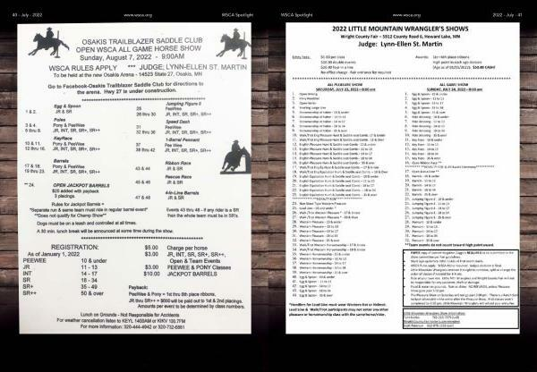 August 19th: WSCA Royalty horse show September 22-26: WSCA Championship Show