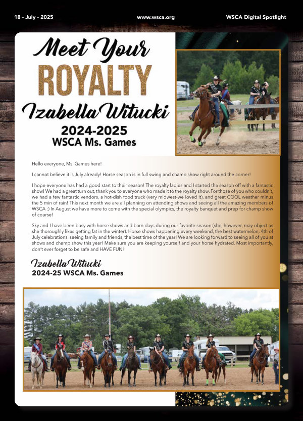 I hope everyone has had a good start to their season! The royalty ladies and I started the season off with a fantastic show! We had a great turn out, thank you to everyone who made it to the royalty show. For those of you who couldn’ t, we had a few fantastic vendors, a hot-dish food truck( very midwest-we loved it), and great COOL weather minus the 5 min of rain! This next month we are all planning on attending shows and seeing all the amazing members of WSCA:) In August we have more to come with the special olympics, the royalty banquet and prep for champ show of course!