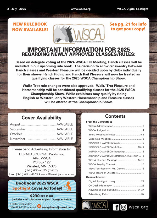 From the Committees WSCA Administration.......................................... 3 WSCA Judges List................................................ 4 Board Meeting Minutes.................................... 5-8 Upcoming Meetings............................................ 8 2025 WSCA CHAMP SHOW Showbill............................... 9 2025 WSCA CHAMP SHOW Info / Rules...................... 10-11 2025 WSCA CHAMP SHOW Sponsorships....................... 12 2025 WSCA CHAMP SHOW Sponsorship / Ad Agreement.... 13 WSCA Queen’ s Message............................. 14-15 WSCA Royalty Contest..................................... 16 Meet Your Royalty- Ms. Games....................... 18 WSCF Board of Directors.................................. 19