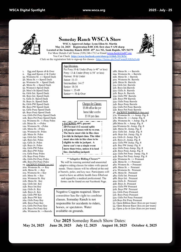 WSCA Approved Judge: Lynn Ellen-St. Martin May 24, 2025 Registration 8:00 AM; first class 9 AM sharp Located at the Someday Ranch 10210 45 th Ave NE, Sauk Rapids, MN 56379 For More Details Call Teresa( 320) 248-1712 or Email teresa. heck @ isd47. org You Can Check https:// www. facebook. com / share / g / 1EBdL7FCWN / Click on the registration link to sign-up for classes: https:// forms. gle / ZygYwnnJUQS3n5v46
