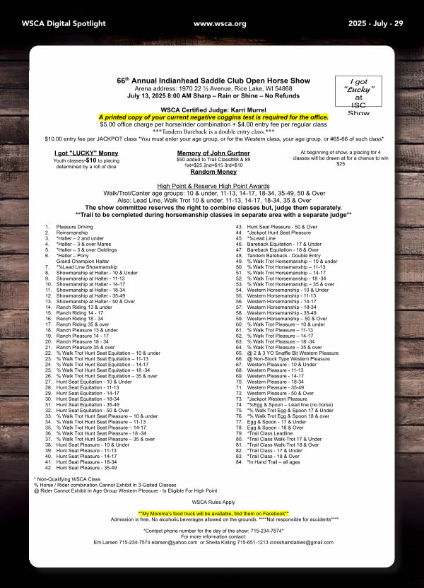 66 th Annual Indianhead Saddle Club Open Horse Show Arena address: 1970 22 ½ Avenue, Rice Lake, WI 54868 July 13, 2025 8:00 AM Sharp – Rain or Shine – No Refunds