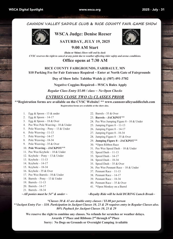 10. Pole Weaving – JACKPOT ** 11. Pee Wee Keyhole – 10 & Under 12. Keyhole – Pony – 13 & Under 13. Keyhole – 11-13 14. Keyhole – 14-17 15. Keyhole – 18-34 16. Keyhole- 35 & Over 17. Pee Wee Barrels- 10 & Under 18. Barrels – Pony – 13 & Under 19. Barrels- 11-13 20. Barrels- 14-17 |