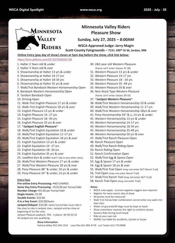 WSCA Approved Judge: Jerry Magin Scott County Fairgrounds – 7151 190 th St W, Jordan, MN Online Entry( pay day of show) closes at 5pm day before the show, click link below: https:// form. jotform. com / 251527546292158