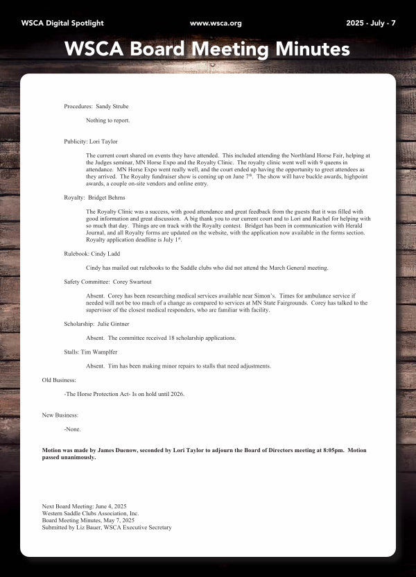 Next Board Meeting: June 4, 2025 Western Saddle Clubs Association, Inc. Board Meeting Minutes, May 7, 2025 Submitted by Liz Bauer, WSCA Executive Secretary