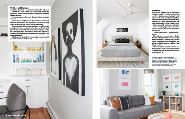 She says she leaned hard on tough fabrics and accessible storage throughout the house , particularly in the playroom . Here , Sanford hung black and white art from the homeowners ’ collection — edgy yet playful portraiture that speaks to the adults in the room — opposite colorful drawings by the eldest child that Sanford had matted and framed .