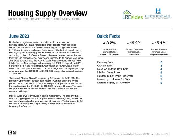 Limited existing-home inventory continues to be a boon for homebuilders , who have ramped up production to meet the rising demand in the new-home market . Nationally , housing starts were up 21.7 % month-over-month as of last measure , the fastest pace in more than a year , while housing permits climbed 5.2 % month-over-month , according to the U . S . Census Bureau . Renewed interest in new homes this year has helped builder confidence increase to its highest level since July 2022 , according to the NAHB / Wells Fargo Housing Market Index ( HMI ). For the 12-month period spanning July 2022 through June 2023 , Pending Sales in the Hilton Head Association of REALTORS ® region were down 19.9 percent overall . The price range with the largest pending sales gain was the $ 750,001 to $ 1,000,000 range , where sales increased 3.2 percent .