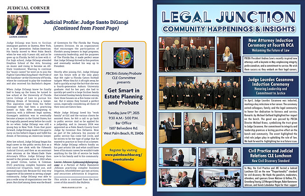 In April, Judge Lourdes Casanova was inducted, marking a key milestone in her career. The ceremony united colleagues, family, and the legal community to honor her dedication to fairness and service. Remarks by Michael Gelfand highlighted her impact on the bench. The gavel was passed by PBCBA Director Michael Kranz, symbolizing the trust given to Judge Casanova. Her commitment to integrity and leadership promises a lasting positive effect on the bench and community. The event highlighted the vital role judges play in upholding the rule of law. We look forward to highlighting her in a future issue.
