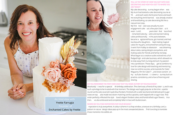 TELL US THE STORY OF HOW YOU GOT INTO CAKE DECORATING AND HOW YOU GOT TO WHERE YOU ARE TODAY? My cake decorating journey began when I was 17. My mum had started a cake decorating course at TAFE, and each week she ' d come home and teach me everything she ' d learned. I was already creative and loved baking, so cake decorating felt like a natural next step. My first " real " cake was actually my own engagement cake just a few years later. But it wasn’ t until 2013— 19 years later— that I launched Enchanted Cakes by Yvette and started making cakes professionally. In the years between, I became a Registered Nurse, got married, and had two beautiful daughters. I kept making magical cakes for my girls, and somewhere along the way, it went from hobby to obsession— I was dreaming about cakes, seeing designs everywhere, and making cakes for friends and family nonstop. What began as a creative outlet evolved into a fullfledged high-end cake business, which allowed me to step away from nursing and turn my passion into a profession. These days, I get to combine my love for cake design with teaching and mentoring. I now run online courses, write tutorials for Cake! Magazine, film for Cake! TV, and share content on my YouTube channel. It’ s been a journey built on practice, consistency, and a love of learning and sharing.