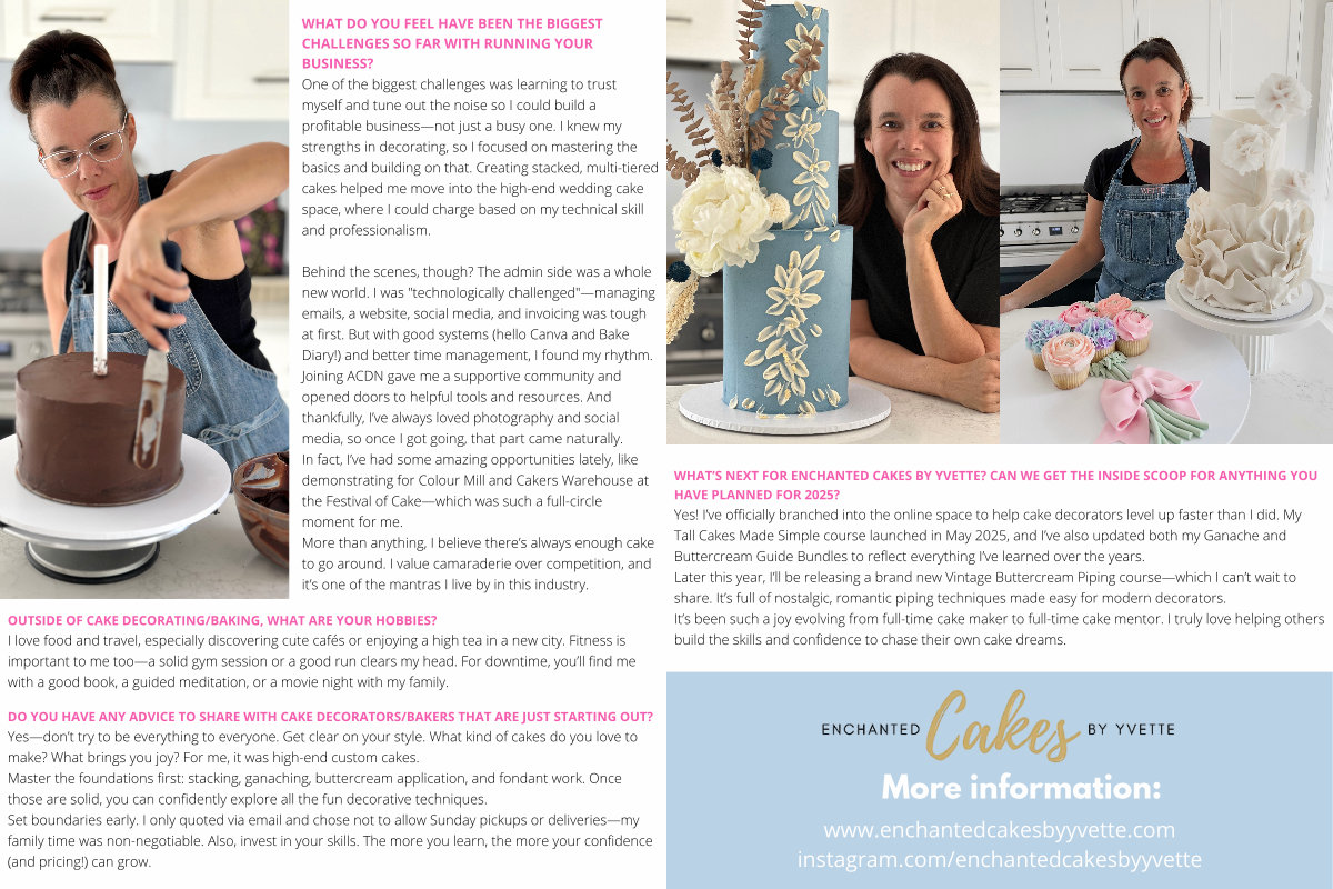 Behind the scenes, though? The admin side was a whole new world. I was " technologically challenged "— managing emails, a website, social media, and invoicing was tough at first. But with good systems( hello Canva and Bake Diary!) and better time management, I found my rhythm. Joining ACDN gave me a supportive community and opened doors to helpful tools and resources. And thankfully, I’ ve always loved photography and social media, so once I got going, that part came naturally. In fact, I’ ve had some amazing opportunities lately, like demonstrating for Colour Mill and Cakers Warehouse at the Festival of Cake— which was such a full-circle moment for me. More than anything, I believe there’ s always enough cake to go around. I value camaraderie over competition, and it’ s one of the mantras I live by in this industry.