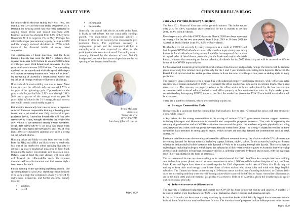 The property space continues to be a mixed bag with industrial property performing strongly , while office and retail property trusts remain impacted by COVID . It is likely the office market was sold down to extreme levels , which have seen recovery . The recovery in property values in the office sector is being underpinned by the low interest rate environment with external sales of industrial and office property at low capitalization rates i . e . high market prices notwithstanding the ongoing COVID impacts . In effect , the market has discounted COVID as a health event which will be overcome .