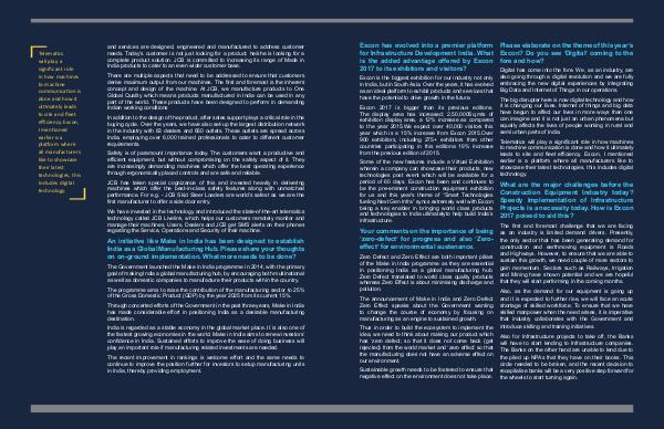 Telematics will play a significant role in how machines to machine communication is done and how it ultimately leads to site and fleet efficiency. Excon, I mentioned earlier is a platform where all manufacturers like to showcase their latest technologies, this includes digital technology. and services are designed, engineered and manufactured to address customer needs. Today’ s customer is not just looking for a product; he / she is looking for a complete product solution. JCB is committed to increasing its range of Made in India products to cater to an even wider customer base.