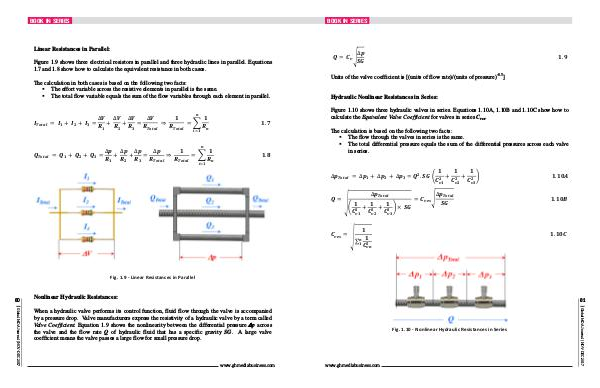 Figure 1.9 shows three electrical resistors in parallel and three hydraulic lines in parallel. Equations 1.7 and 1.8 show how to calculate the equivalent resistance in both cases.