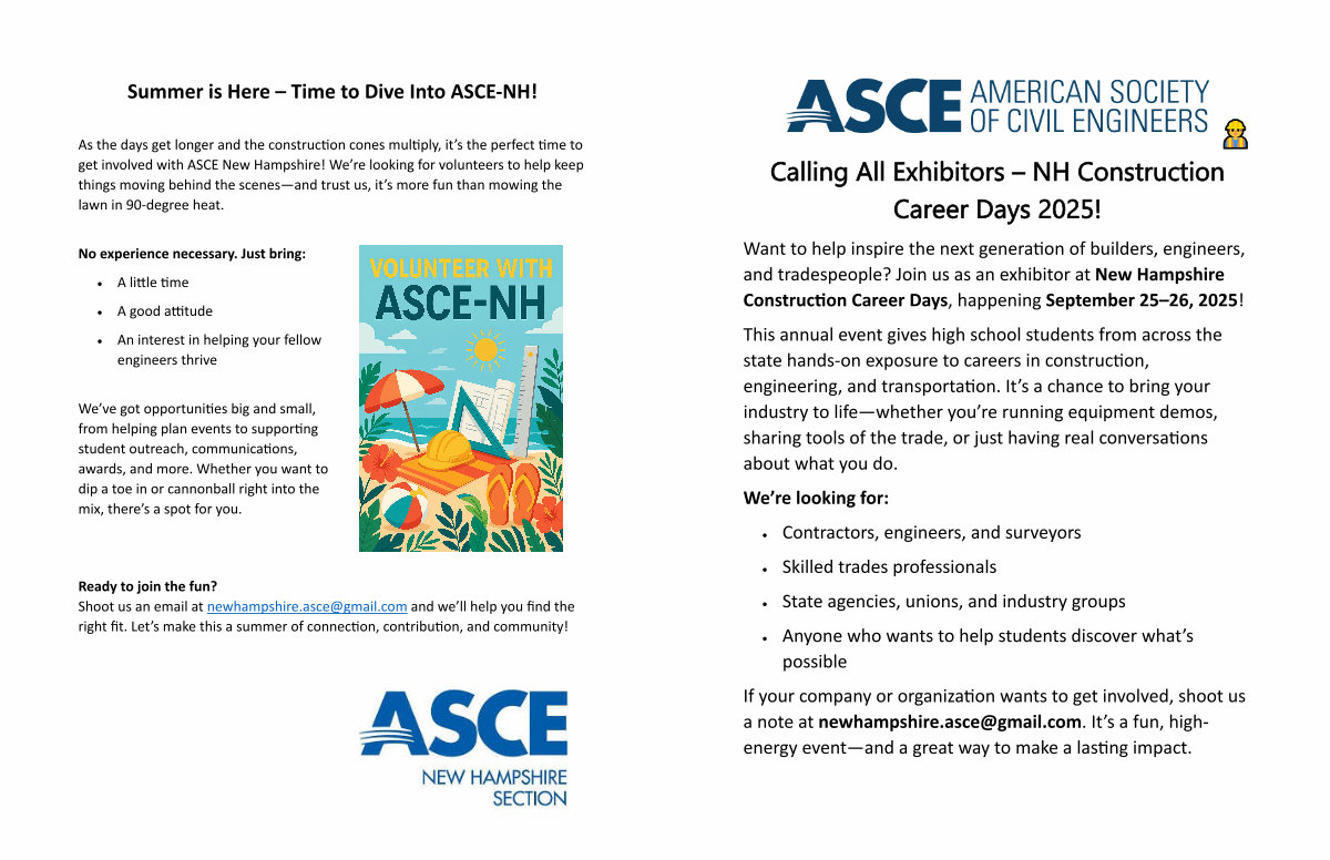 If your company or organization wants to get involved, shoot us a note at newhampshire. asce @ gmail. com. It’ s a fun, highenergy event— and a great way to make a lasting impact.