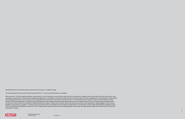 Offers valid June 3 -28 , 2024 through all Hilti Stores , Customer Service , and the Hilti website , unless otherwise noted . Prices do not include tax or shipping . Hilti may cancel offers at any time without notice . Offers only apply to purchases direct from Hilti and only available while supplies last . Promotional item number ( s ) for the Bits , Blades and Chisels , Storefront , Handrail , Hanging Boards , Track Fastening and Cable Fastening & Wire Hanging Special Offers must be included on the initial qualifying order and these offers cannot be purchased online . Limit of 10 promotional items per customer on each of the Bits , Blades and Chisels , Storefront , Handrail , Hanging Boards , Track Fastening and Cable Fastening & Wire Hanging purchase and receive special offers . May not be combined with any other offer . Offers with spend thresholds cannot be combined or stacked . Offers are not available to Authorized Distributors , resellers or national rental customers . Rental customers should contact their Hilti representative regarding eligibility . Offers void where prohibited or restricted by law , regulation , or customer rules . Government accounts may participate if their procurement rules allow . Return of product which results in initial order falling below qualifying levels will result in promotional item being billed to purchaser at full value . Separate orders may not be combined to reach qualifying levels . Past orders do not qualify . Monthly charges require a Fleet account . See your Hilti representative for details .
