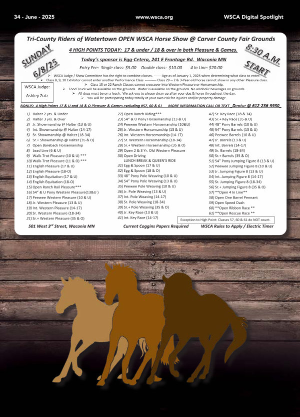 Tri-County Riders of Watertown OPEN WSCA Horse Show @ Carver County Fair Grounds 4 HIGH POINTS TODAY: 17 & under / 18 & over in both Pleasure & Games. Today’ s sponsor is Egg-Cetera, 241 E Frontage Rd. Waconia MN Entry Fee: Single class: $ 5.00 Double class: $ 10.00 4 In Line: $ 20.00