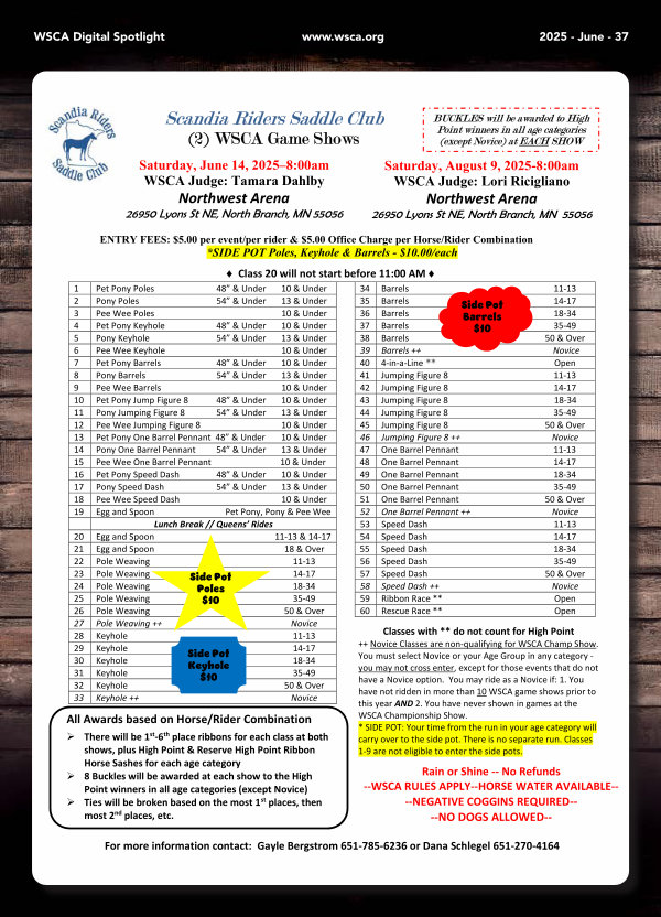 Saturday, June 14, 2025 – 8:00am WSCA Judge: Tamara Dahlby Northwest Arena 26950 Lyons St NE, North Branch, MN 55056