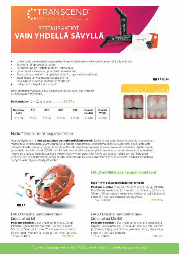 Pakkaus sisältää 2 kpl Universal-renkaita, 25 kpl jokaista Firm Bands-matriisia: 3,5 mm, 4,5 mm, 5,5 mm, 6,5 mm ja 7,5 mm, 25 kpl kutakin kokoa muovikiiloja: Small, Medium ja Large ja 1 kpl Halo-karuselli säilytysrasia. Til. nro UD4834