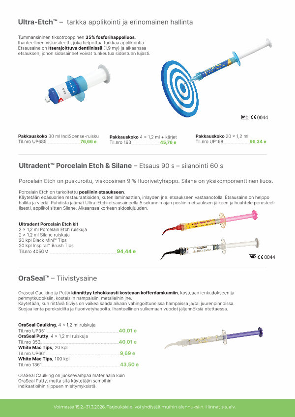 OraSeal Caulking, 4 x 1,2 ml ruiskuja Til. nro UP351 OraSeal Putty, 4 x 1,2 ml ruiskuja Til. nro 353 White Mac Tips, 20 kpl Til. nro UP661 White Mac Tips, 100 kpl Til. nro 1361