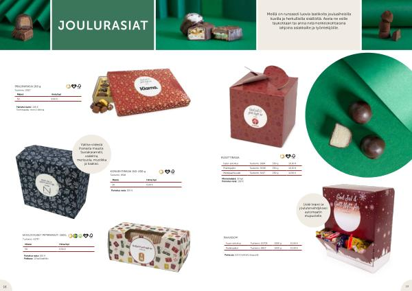 Meillä on runsaasti luovia laatikoita jouluaiheisilla kuvilla ja herkullisilla sisällöillä . Aseta ne esille taukotilaan tai anna niitä henkilökohtaisina lahjoina asiakkaille ja työntekijöille .