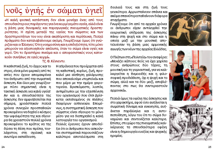 «Η καλή φυσική κατάσταση δεν είναι μονάχα ένας από τους σπουδαιότερους παράγοντες για ένα κορμί γεμάτο υγεία, αλλά είναι η βάση μιας δυναμικής και παραγωγικής πνευματικής δραστη-ριότητας. Η σχέση μεταξύ της υγείας του σώματος και των δραστηριοτήτων του νου είναι ακαθόριστη και περίπλοκη. Πολλά πράγματα δεν καταλαβαίνουμε ακόμη. Γνωρίζουμε όμως ότι γνώ-ριζαν και οι Έλληνες: Ότι η νοημοσύνη και η επιδεξιότητα, τότε μόνο μπορούν να αξιοποιηθούν απόλυτα, όταν το σώμα είναι υγιές και γερό. Ότι το δραστήριο πνεύμα και ο αποφασιστικός νους κατοι-κούν συνήθως σε υγιές κορμί».