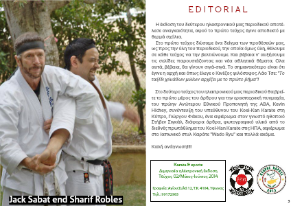 Στο δεύτερο τεύχος του ηλεκτρονικού μας περιοδικού θα βρεί-τε το πρώτο μέρος του άρθρου για την ερασιτεχνική πυγμαχία, του πρώην Ανώτερου Εθνικού Προπονητή της ΑΒΑ, Kevin Hickey, συνέντευξη του υπεύθυνου του Koei-Kan Karate στη Κύπρο, Γιώργου Φάκου, ένα αφιέρωμα στον γνωστό ηθοποιό Στήβεν Σιγκάλ, διάφορα άρθρα, φωτογραφικό υλικό από το διεθνές πρωτάθλημα του Koei-Kan Karate στις ΗΠΑ, αφιέρωμα στο Ιαπωνικό στυλ Καράτε "Wado Ryu" και πολλά ακόμα.